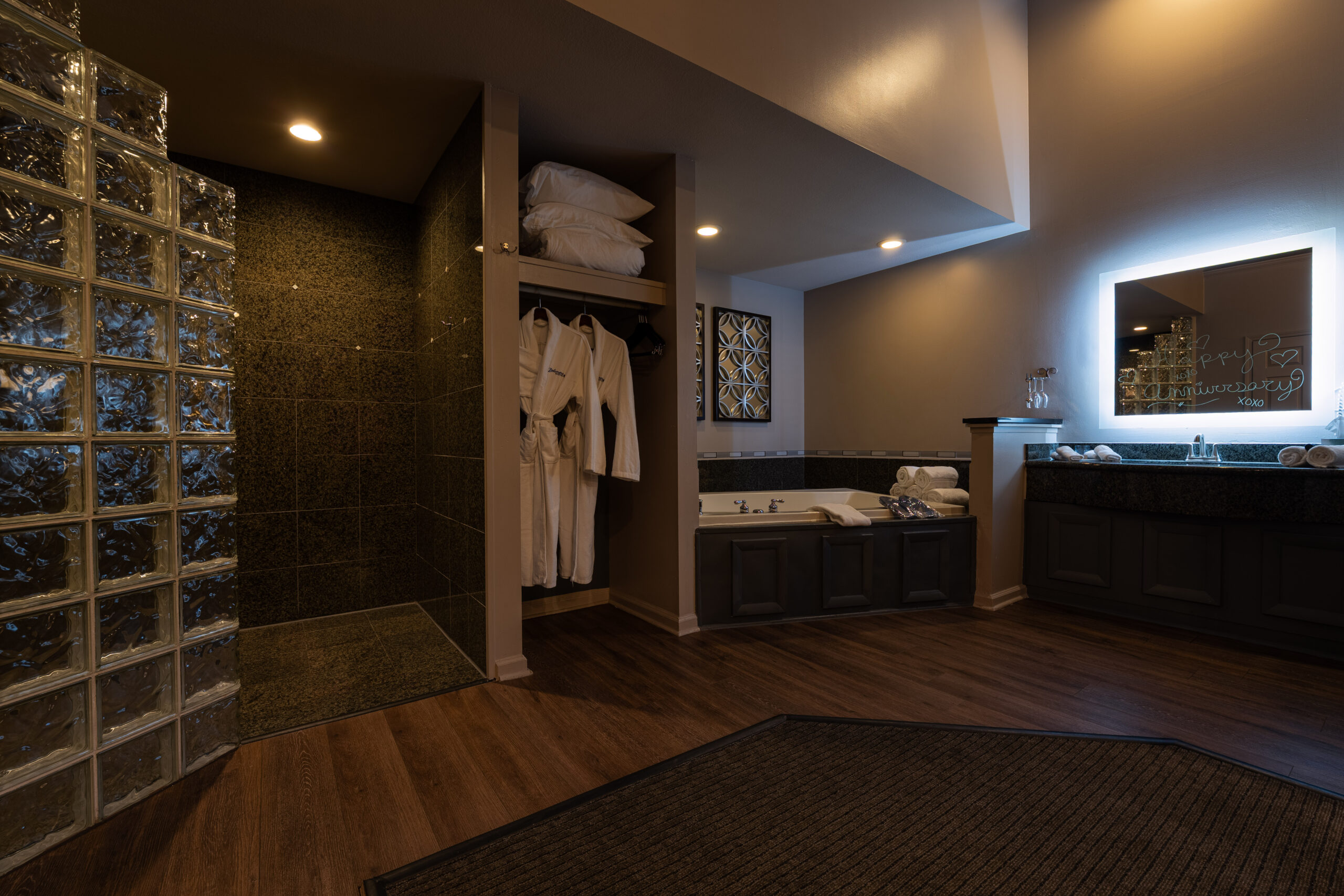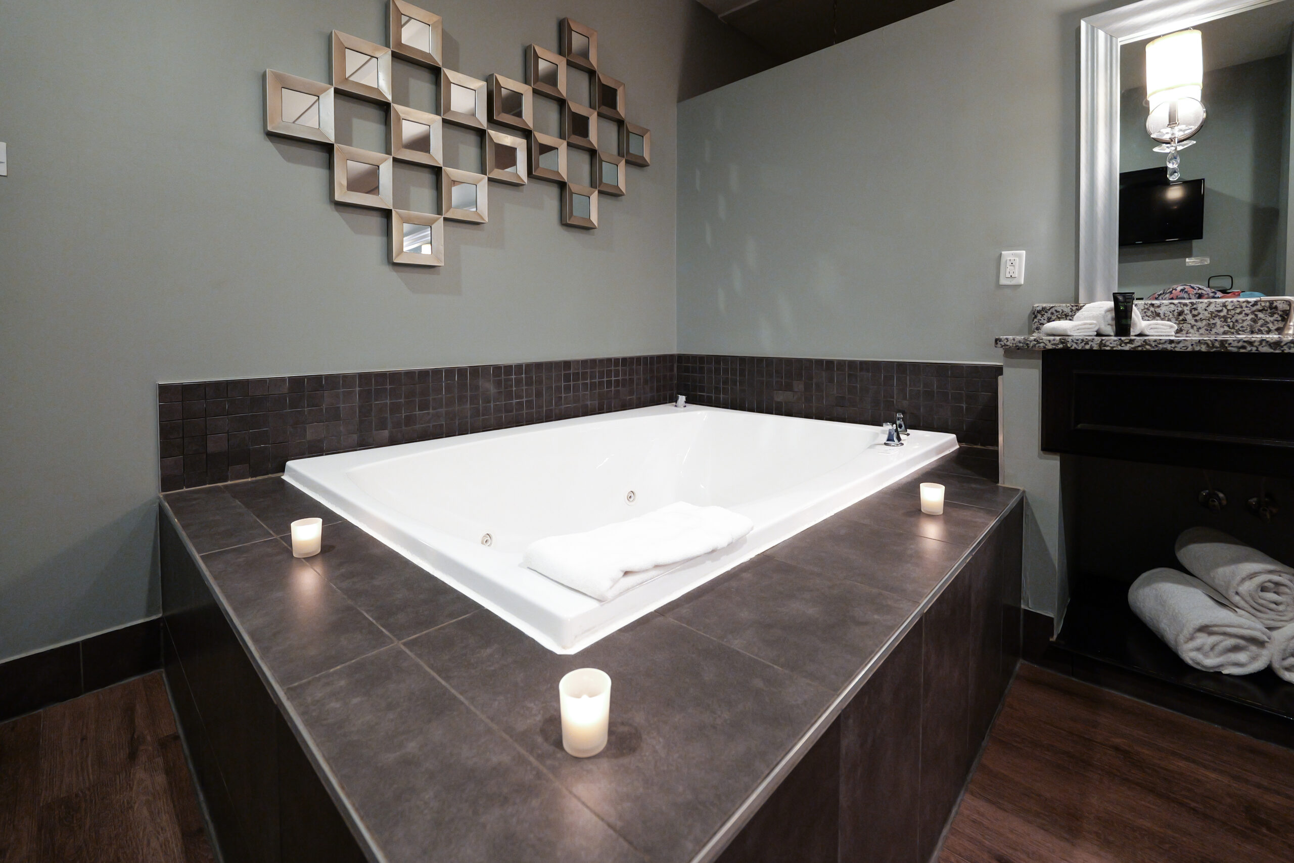 • Oversized whirlpool tubs for two to unwind together.